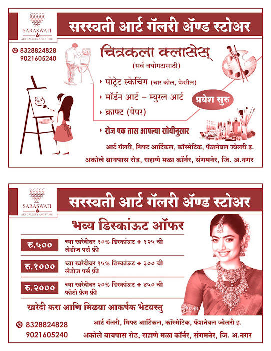 म्युरल वर्क सेम खाली फोटो मध्ये असलेले वर्क करून मिळेल , भिंतीवरती सुद्धा करून मिळेल खलील वर्क पाहण्या साठी भेट द्या सरस्वती आर्ट गॅलरी अँड स्टोर , अकोले बायपास रोड , राहणे मळा कॉर्नर संगमनेर , 8329924828