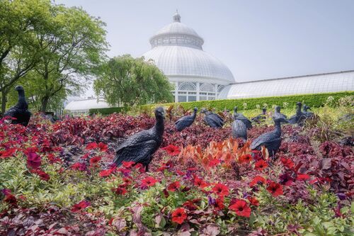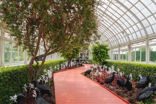 At the New York Botanical Garden (NYBG), life-size sculptures of jet-black vultures by artist Ebony G. Patterson sparkle subtly in the sunlight as viewers meander their terrain. These birds huddle around pools of blood-red plants—begonias, caladium, hypoestes, and impatiens—that appear like bruises on an otherwise pastel-colored landscape surrounding the 1902 Haupt Conservatory. Inside the historic greenhouse, more vultures have ventured, joining a molting, all-white peacock, while a zigzagging pathway is lined with frosted cast-glass sculptures of extinct plants the artist found in the garden’s archive.
