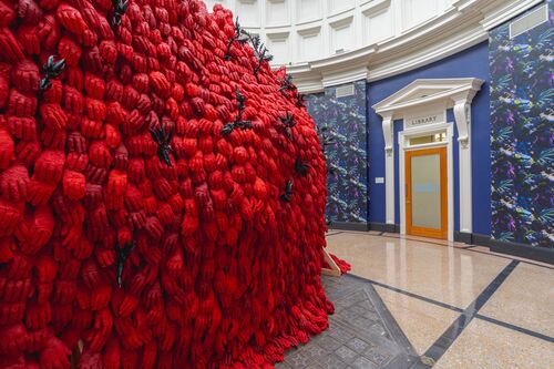 In the stately library on the NYBG’s 250-acre campus, Patterson’s 2023 work …fester… displays this sentiment around exploitation clearly. One side of the installation is an embellished tapestry of floral wallpapers and gold-leaf skeletal parts; the other is a slump of more than 1,000 red lace–gloved hands, embedded with black cast-glass thistles. Underneath the beauty of cultivated gardens is a more nuanced conversation about origins and labor. “So much of the language used in conversations around the way we think about gardens in terms of the socioeconomic hierarchies we’ve inherited could be equated to the way we think about people,” she continued.