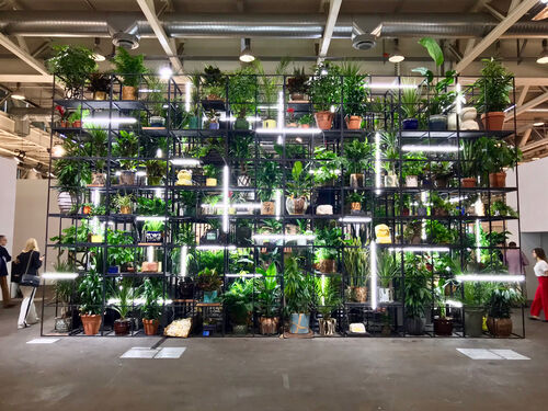 Rashid Johnson’s recent mixed-media installation series also draws on houseplants’ connection to domesticity. In Antoine’s Organ (2016), currently on view at the Isabella Stewart Gardner Museum’s group show “Presence of Plants in Contemporary Art,” a black steel grid is brimming with 285 container plants that hide a piano at its center. Curators Pieranna Cavalchini and Charles Waldheim chose to stage the eight-artist exhibition that opened this month in Boston, because of the sheer breadth of contemporary artists using ephemeral, living material.