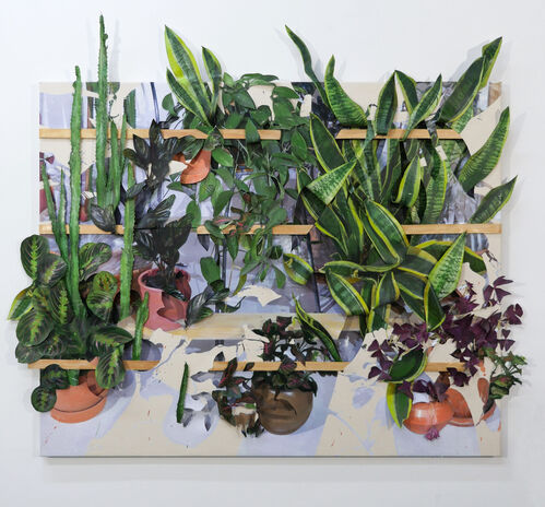 At Halsey McKay Gallery’s booth at NADA New York this past spring, Brooklyn-based artist David Kennedy Cutler presented a recent evolution in his practice: layered canvases bursting with popular houseplants that aren’t real, but certainly look it. In 2013, Cutler began using such depictions of plants alongside his and his wife’s bodies, their clothes, food, and studio or home tools as “surrogate humanity” in works that “talk about introversion and proximity of digital culture and what it was doing to us,” he explained.