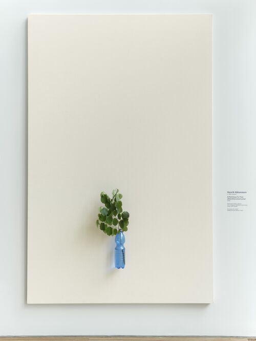 Swedish artist Henrik Håkansson also explores the the impact of humans on our environment with the 2021 wall-based work A Painting of a Tree (Ailanthus altissima), for which he inserted leafy cuttings of tree of heaven, a native Chinese plant that is considered invasive in Massachusetts, in plastic bottles attached to canvas. The poetic piece urges viewers to question what the term “invasive” really means—whether nature, or litter, is the greater problem.