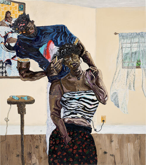 The large-scale portrait, a tender interior scene featuring an at-home haircut, is typical of the artist’s practice. Taking cues from artists like Charles White and Kerry James Marshall, Nkoth uses vibrant colors and loose, expressive brushstrokes to create images of Black diasporic communities that draw on his own experiences of immigration and cultural dislocation.