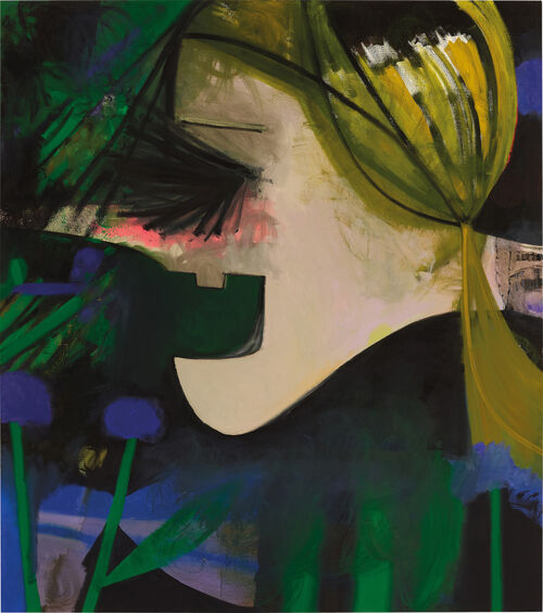 Drawing inspiration from Japanese woodblock prints, Abstract Expressionism, and Pop Art (especially the work of Robert Rauschenberg), Berkenblit’s expressive paintings grapple with questions of gender and consumerism in the late 20th and early 21st centuries. The artist’s distinctive vibrant, yet spatially flat, style is achieved through her masterful use of gouache on paper, which allows colors like cardamom yellow, purple, and hot pink to pop against her black backgrounds. Her most recent solo exhibition, “Norton,” was held at Anton Kern earlier this year (her ninth with the New York gallery).