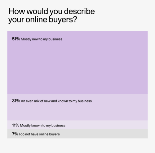 In a post-pandemic world, online still remains a crucial source of growing revenue for small galleries. According to our survey, 51% stated that the online buyers they encountered last year were entirely new to their business. Additionally, 31% reported a relatively equal mix of known and new buyers in their online transactions.
