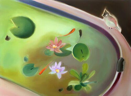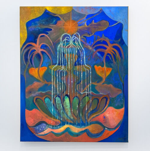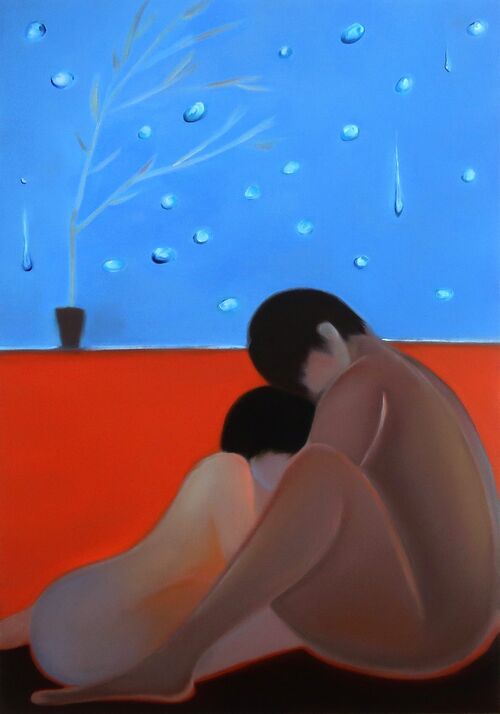 These strategies are on view in Tan’s latest body of work, shown by Taymour Grahne Projects in a recent online solo exhibition. Titled “Innermost Things,” the show is flush with tenderness and intimacy: Hands reach for another, couples embrace, animals appear in pairs. In the bittersweet Rainy Day (2022), one figure holds another close against a background of raindrops suspended in the sky like tears rolling down a face. The backdrop and the body merge in Like Mountain Like Sea (2022), where a scene of two mountains bisected by a river also resembles the perspective of a person observing her own torso and legs while lying down.