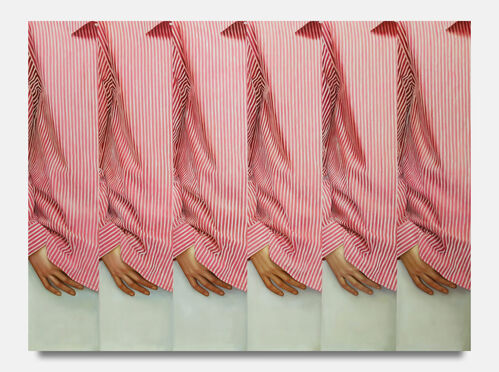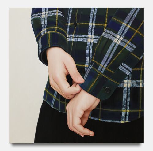 A cozy wool sweater, a relaxed plaid button-down—so often, clothes are visual cues that explain something about the person wearing them. In Murray Clarke’s recent solo show at Moosey, the London-based painter zoomed in on these sartorial choices, depicting fabrics and outfits in magnified, photorealistic detail. The work titles, too, reveal the artist’s focus, referencing commercial product descriptions, like Extra Fine Checked Oxford (2022), where the soft checked fabric of a long-sleeved shirt takes up most of the canvas. The wearer is visible only by their hands, shown carefully tugging the edge of the sleeve to meet the wrist.