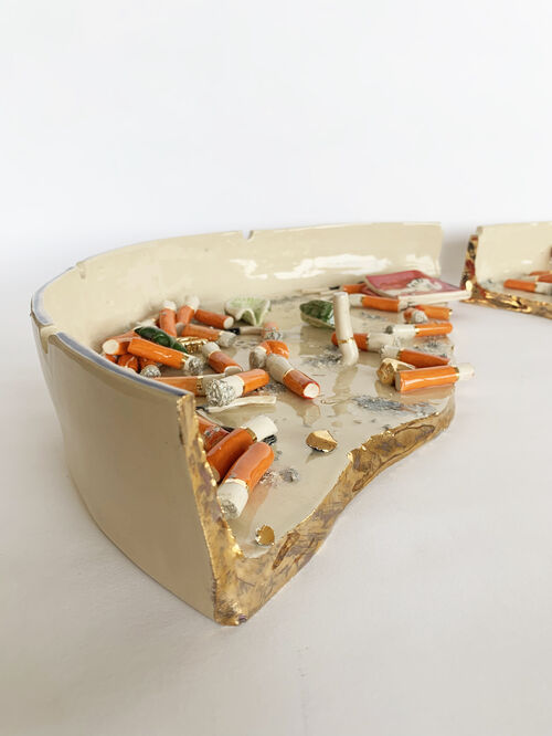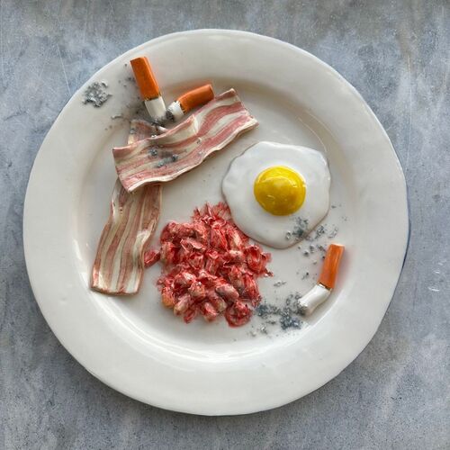 Now wildly popular, Berrow’s work has landed her several notable solo and group exhibitions. Recently, she was included in Unit London’s group show “London Calling.” Her exhibited work, Fried (2023), depicts a fry up, an English breakfast staple, cheekily framed with her trademark ceramic cigarette butts.