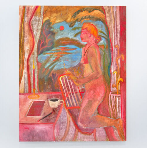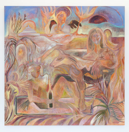 Margaret R. Thompson’s misty, narrative paintings offer a sense of balance—between fantasy and reality; landscape and interiors; figuration and abstraction; calm and excitement. The Santa Fe–based artist’s soft, entrancing scenes are painted in wispy washes of color, built up from an array of materials including oil paint, wax, sand, turmeric, raw pigments, and earth, among others. In the resulting works, figures melts into their environs or a natural landscape hums with life, conveying the artist’s interests in the sacred, dreams, and otherworldly life.