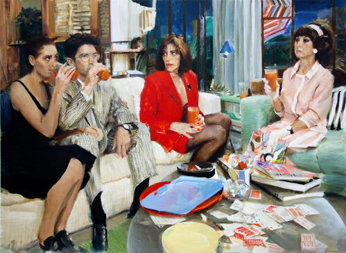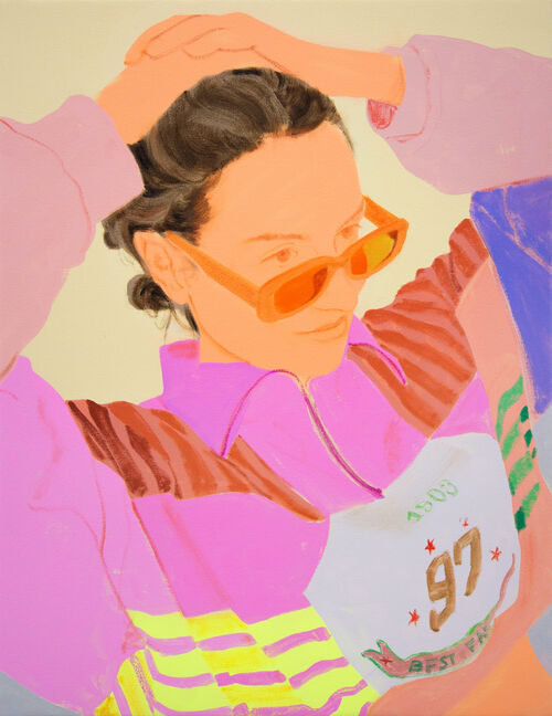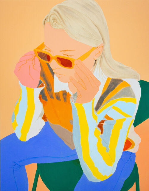 Highlights include a dazzling painting by the rising British artist Murray Clarke, featuring a figure repeated three times across the canvas, wearing perfectly matching blue-and-white pajamas, rendered in painstaking detail. Notable, too, are the warm, sundrenched paintings of Moritz Moll, in which women in sunglasses and striped clothes relax in glowing orange environs.