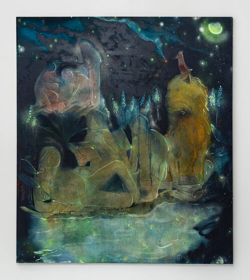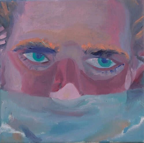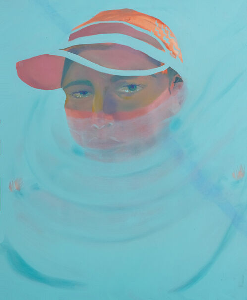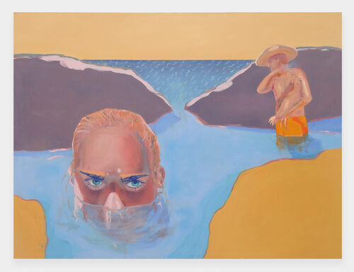 The 20 oil paintings on view, created over the past three years, portray figures submerged in water or by the sea, their bodies and faces distorted by washes of aqua and blue or illuminated by the water’s reflective light. In several striking works, the protagonists’ eyes are just above the surface, gazing at the viewer intently. In the exhibition essay, Cintra Wilson writes: “Golden’s strengths in this series are her own fluidities—her empathy, which enables her to throw her feelings, her non-binary sexuality, and her egalitarianism into new floating bodies.”