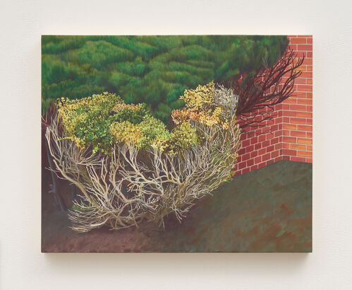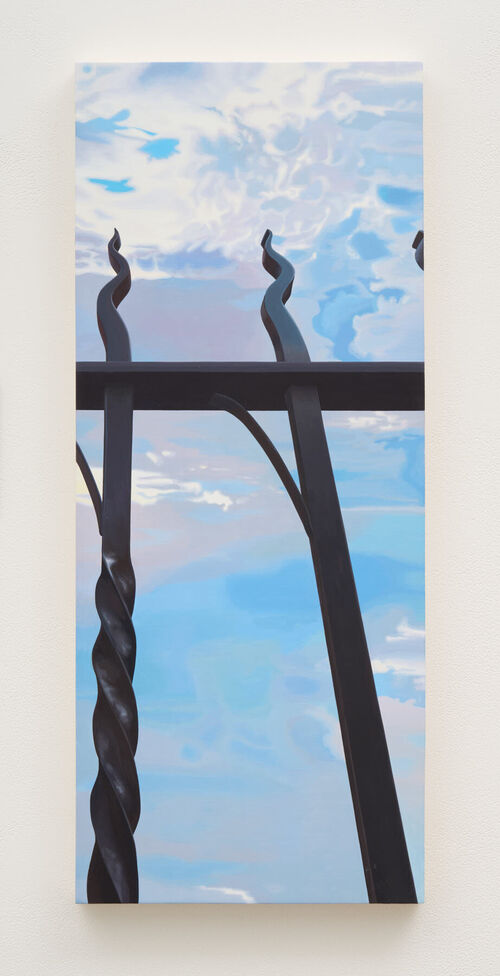 The Arkansas-born, Brooklyn-based artist Lee Maxey considers the distance between the mundane and the mystical in her work. Influenced by her upbringing in a Christian fundamentalist household, she transforms everyday slices of life—like an iron railing before a bright blue sky, or a dying bush beside a brick building—into spectral, foreboding scenes. She paints in egg tempera, a medium commonly associated with medieval religious paintings with persuasive intentions. “My work highlights the pervasive unease that can come with seeing signs of a larger ‘plan’ in the everyday, while also demonstrating that the ordinary world is a plenty interesting place to exist without outsize meaning,” Maxey explained. “The paintings of this show continue my task of highlighting how highly personalized (and fraught) perception is.”
