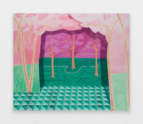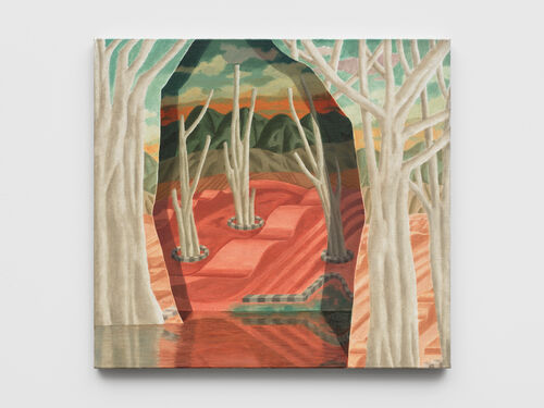 Emerging London-based painter Anne Carney Raines takes a very different approach, using her background in painting theater backdrops to confront the artificiality of the picture plane, as well as, perhaps, our own existence. In interviews, Carney Raines has noted that there is a lot of theater going on in our everyday lives, be it political, on social media, or in the acting out of fake news. In paintings such as Whisky Throttle (2022) or The Duck (2023), she creates dreamlike scenes that the viewer feels almost compelled to reach into.