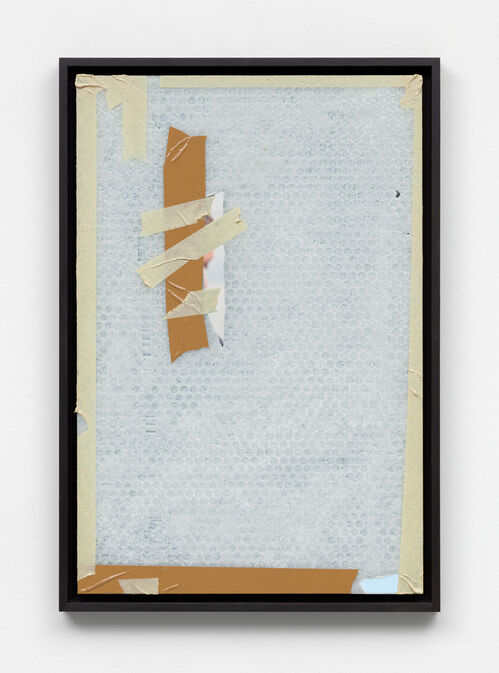 Tape also features in the work of German painter Jochen Mühlenbrink: shiny, brown parcel tape. In a play on the 17th-century tradition of realistically portraying the back of the painting, Mühlenbrink paints his parcel tape holding together sheets of bubble wrap, which appear to be wrapped around a canvas. Elsewhere, it is arranged in random abstract patterns.