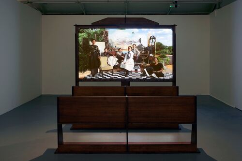 Sunstrum’s installations often grapple with these themes by restaging the heavy, imposing furnishings and interiors of the British imperial era. At the current Liverpool Biennale (through September 17th), her installation Mumbo Jumbo and the Committee (2022) includes authoritarian, Victorian-style hardback wooden pews. Meanwhile in London, “The Pavilion” is based on Victorian cabinets of curiosities, commonly used in instructive environments such as churches, schools, and museums. Rebuilding these structures around her own stories is a renegotiation of the power and hierarchy inscribed in and perpetuated by Victorian design. “I’m bedazzled by it,” she said. “It entices you but it also molds you; it reminds you of your place.” Placing her own works within these rigid structures is a way to find where “there might still be some agency, where there might still be space to usurp that larger system.”