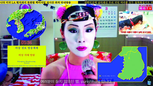 In 2018, a six-minute video entitled BJ Cherry Jang 2018.04 (2018) was uploaded to a YouTube account. At the beginning, the words “Emergency Broadcasting System” flicker in a banal font on a flashing yellow and blue screen. Over the sound of a ticking time bomb, a young Asian woman calling herself BJ Cherry Jang appears and speaks rapidly, announcing that North Korea has launched a missile toward Seoul and the apocalypse will occur at the end of the broadcast. Viewers can survive only by depositing money into her sponsorship account.