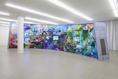 Ryu’s previous sculptural works, such as BigKing Travel-Go Straight (2021)—a dog-shaped object suspended from the ceiling of SongEun Art Space with a QR code to a video—served as gateways to her virtual world. This project, however, within an institution located in an upscale shopping district, allowed her to fully exploit the physical space. Taking center stage was a room-filling installation reminiscent of Richard Serra’s Tilted Arc (1981). Ryu’s focus was not on the sculptural form or materials, however. Instead, printed digital images recalling the imagery in her previous works covered the surface, presenting a repetitive, banal aesthetic akin to a monumental or propaganda-themed park.
