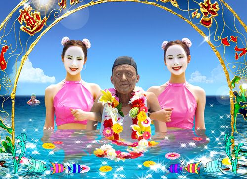 The “BigKing Travel-Ching Chen Tour” (2019–20) series includes poorly edited video footage of unidentifiable vacation destinations, as well as installations loosely borrowing that imagery. The story is simple: An elderly man takes a package tour to the imaginary “Ching Chen” and returns home lifeless. The absurdity reflects the unique format of package tours in Korea—where groups swiftly visit affiliated tourist spots—and is heightened by a mobile, interactive, single-channel video, Bigking Travel 2020 (2020). In this work, Ryu’s other persona Natasha, a local tour guide, willingly sexually objectifies herself, using exaggerated gestures and excessive kindness to welcome the elderly, revealing the trip’s impure purpose.