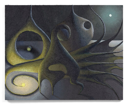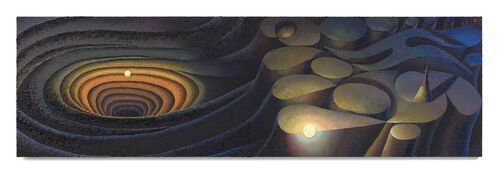 The shadowy vistas, unsettling forms, and Caravaggesque lighting of the paintings convey extreme psychological states and the human subconscious, which are enhanced by the sometimes-menacing, sometimes-cradling frames.