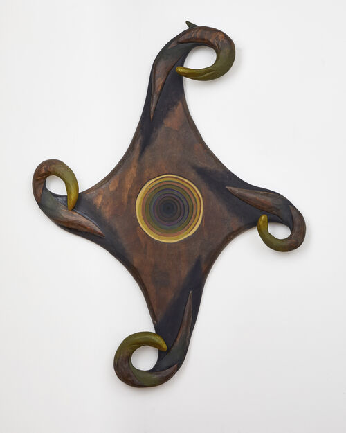 I was first introduced to Adamerovich’s surrealistic, biomorphic works several years ago via the Canadian gallery Pangée, and have been infatuated by the way her painting, sculpture, and furniture-making practices dialogue and intertwine with one another. Many of her paintings are wrapped and encased in hand-carved and fire-singed frames; with their rippling spikes and swirling tentacles, these sculptural wood elements both conceal and reveal Adamerovich’s otherworldly canvases, transcending the traditional purpose of a frame.