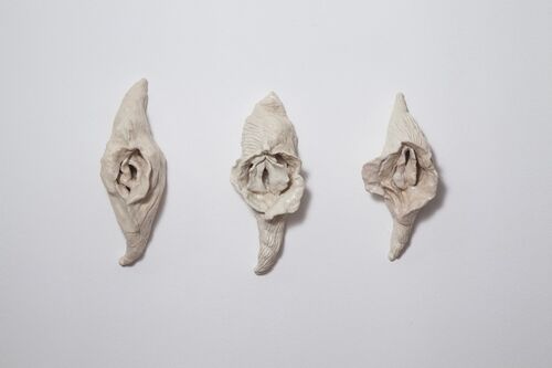 Baltar carried out actions that favored the fleeting and the ephemeral. For example, in Mist Collecting (1999), she collected mist into a glass bottle, documented in a series of color photographs. In her later works, Baltar increasingly referenced the body rather than landscape; for example in a group of minute ceramic sculptures titled The vagina seashells (2017), part of the group show “Meu corpo: território de disputa” (“My body: territory of dispute”) at Nara Roesler, the gallery representing Baltar.