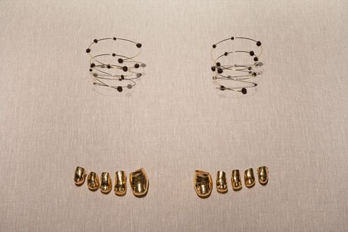 Baptistelli recently garnered critical attention with his solo show at one of São Paulo’s preeminent contemporary art galleries, Galeria Luisa Strina, which now represents him, entitled “4.000 A.D.” In that show, the artist presented gold-plated objects in the shape of his own body parts, all pristinely laid out in a glass vitrine, in a dark space—as if inside an ancient sarcophagus. Baptistelli lifted the title from a poetic manifesto by the Dutch Surinamese conceptual artist Stanley Brouwn that itself envisioned a distant future, where art no longer exists, but space and movement endure. Reflecting his interest in urban music, Baptistelli also participated in the exhibition “The Culture: Hip Hop and Contemporary Art in the 21st Century” at the Baltimore Museum of Art in 2023.