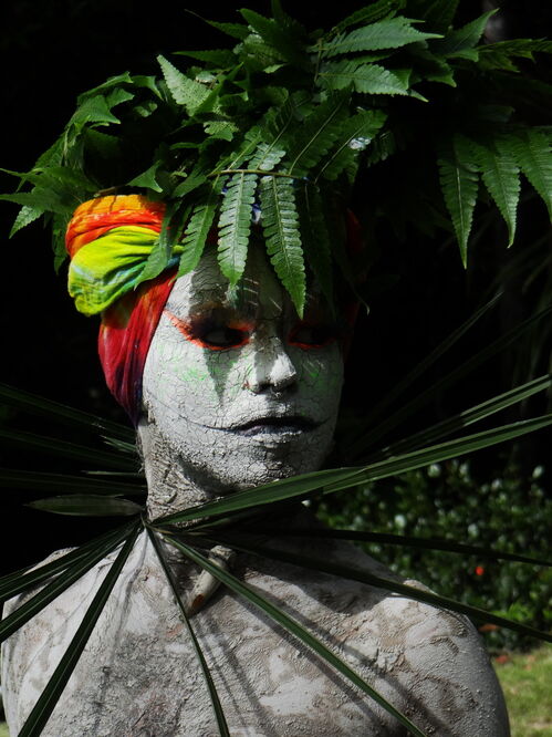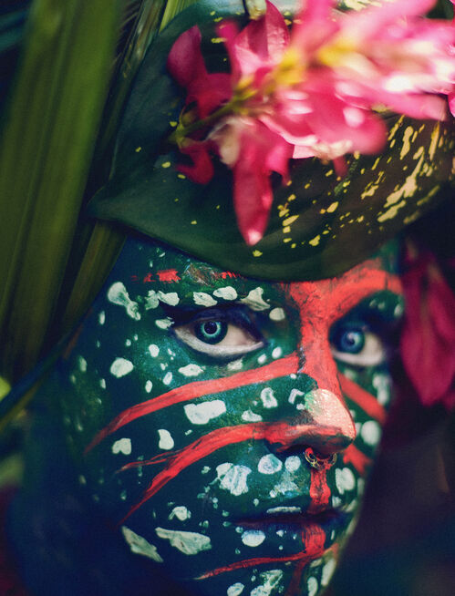 With a background in biology and a master’s degree in ecology, Uýra (who is often known by only one name) is a veritable meteor on the Brazilian art scene. The artist’s interests include plant life, gender fluidity, Indigenous rights, and post-colonialism, and her works featured in the 34th São Paulo Bienal were a fine example of this rich amalgam: A series of photographs, bursting with color, showed Uýra as a hybrid forest being amid plentiful plant life.