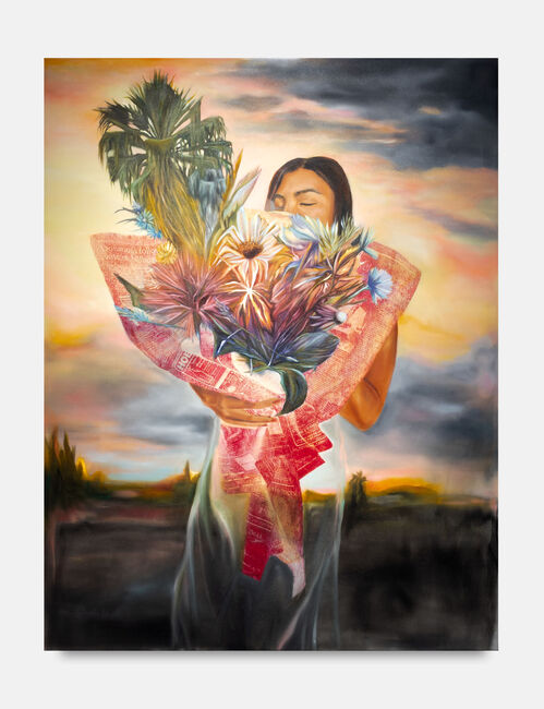 This strategy is in fact common among various artists based in L.A. Jessica Taylor Bellamy’s sort-of portrait Prophetess of the Region (2023), for instance, deploys whirling oranges and grays to create a skyscape that her subjects, a photorealistically portrayed woman with closed eyes and a bouquet of flowers, seem to disappear into. Perhaps it’s not surprising, given California’s experience of smoke-logged atmospheres caused by pollution and frequent wildfires.