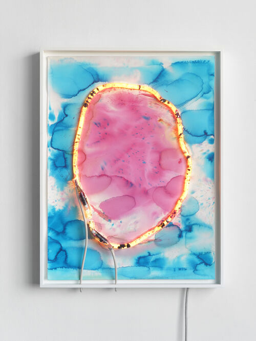 Themes of place, home, and connection are equally important to the artists on their roster. The Peruvian artist C.J. Chueca, who splits her time between Lima and New York, makes ceramics resembling airplane windows that frame striated skies, which reflect her memories of being what she calls a “perpetual immigrant.” Martín Touzón carries pieces of his native Argentina with him around the world in the form of pulped fabric he salvages from coin laundromats in Buenos Aires, which he fashions into mixed media wall works. Johannesburg-based artist Turiya Magadlela, meanwhile, sews, rips, and stretches nylon pantyhose over canvases, creating kaleidoscopic meshes of light, color, and tension that evoke both the strained gender and labor politics of South Africa as well as the Lower East Side’s historic garment industry, which in the 1800s formed the livelihood of many of the city’s immigrants.
