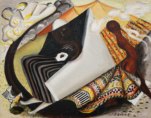 In the 1940s, Bongé began to draw inspiration from her dreams, in particular the colors, shapes, and imagery that appeared. For much of the next decade, she translated these dreams and internal feelings through Surrealism, incorporating elongated figures, floating masks, and indistinct objects melting into the background and one another.