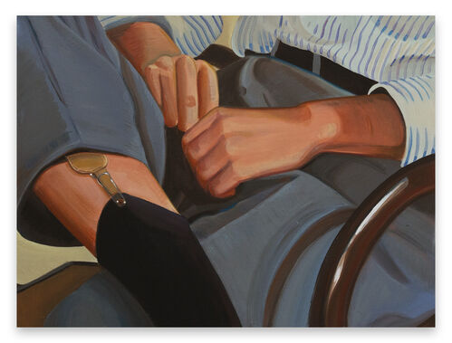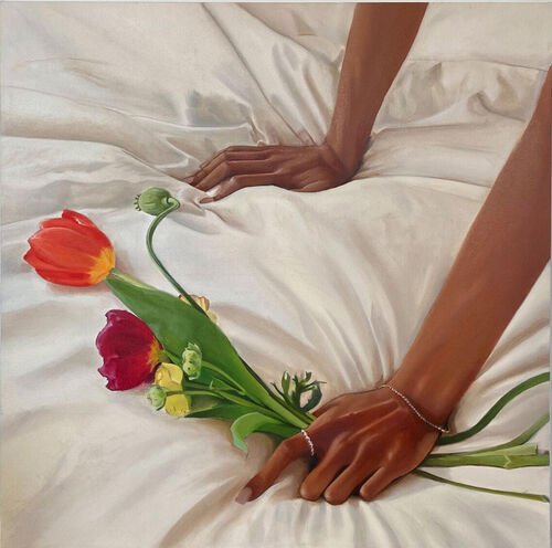 The artist’s close-cropped scenes of apparently desultory moments ripple with drama and the movement of luscious fabrics on anonymous bodies. Cocktail glasses, caviar, and formal tablescapes all conjure an atmosphere of decadence and refinement. “I wouldn’t say seduction is something I ever set out to depict, but I think the manifestation of the pure bliss I feel while I’m painting is what comes through and reads as sexy,” the artist told Artsy. “It’s kind of magic. I would consider myself a tactile, materialistic person, so I get great pleasure out of painting fabrics, metals, and skin.”