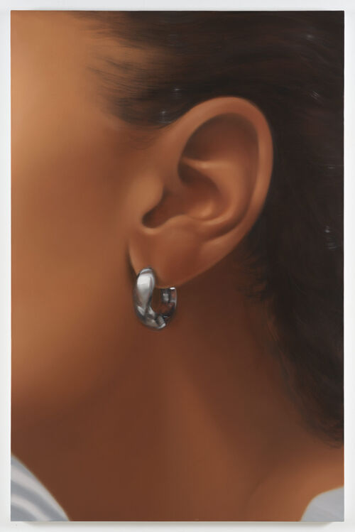 At Alexis Ralaivao’s current exhibition at Kasmin in New York (on view until August 11th), 11 studies in oil paint all seem to shimmer with soft delight: a sumptuous silk scarf tied in a bow on a crisp white shirt; an elegant, silver hoop earring dangles effortlessly from an earlobe. Fascinated with tonal contrasts, transparency, and light, Ralaivao, who was featured in the 2022 edition of The Artsy Vanguard, explained that his interest in portraying finery came from looking at the details of Old Masters paintings.