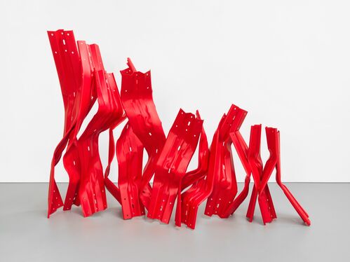The materials in German artist Bettina Pousttchi’s series “Vertical Highways” look oddly familiar. These metal sections are crash barriers, found on highways around the world, which the artist sources new and folds, wrinkles, and bends back to produce unsettlingly wonky standing contraptions. In red, silver, and pewter, they resemble people huddled together, or perhaps crumpled paper strips. There’s something urgent about these vertical, broken, and busted-up crash barriers, which conjure visions of wreckage and its aftermath. In the contrast between their shininess and misshapenness, an undeniable tension emerges.