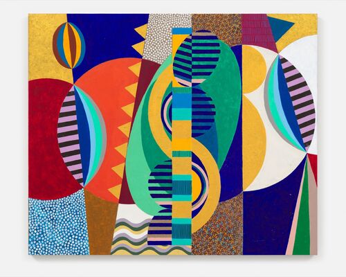 Deeply grounded in the vibrant, spirited traditions of Rio de Janeiro, where she both lives and works, Milhazes takes a more figurative turn in her new work. Paintings like O desfile de leques I (Fan parade I) (2023) and O Arlequim (The Harlequin) (2021–22) are filled with the vivid hues and dynamic rhythms of the famous Rio Carnival. Meanwhile, works like Inteligência das Estrelas (Intelligence of the Stars) (2022) reflect the deep natural connection Milhazes maintains with her surroundings, a recurring theme that is felt in the organic pulse of her work.