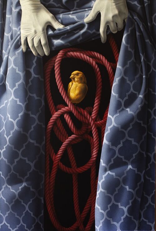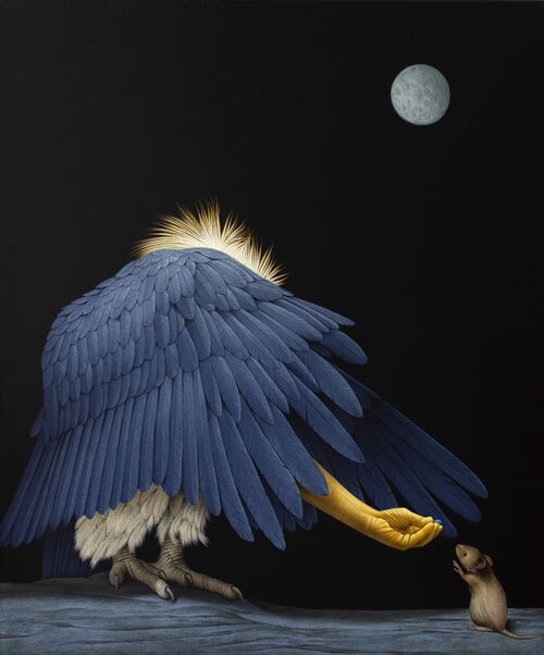 Photorealistic painting seems to be having a bit of a moment, and Eckart Hahn’s surreal, metamorphic canvases certainly fall into that category. Depicting weird encounters between different species—brightly colored pigs, apes, or birds meeting one another in dark, imagined spaces—Hahn’s works recall the empty absurdity of 3D virtual worlds. Offer (2023), for instance, portrays an outstretched human hand pushing out from under the cloaked feathers of an eagle, proffering a tiny blue seed to a mouse. The eagle’s face remains hidden, leaving the viewer guessing at its intentions. “Hart wie Schein” (which roughly translates to “Tough as it looks”) shows a number of paintings playing with this ambiguity in absurd, humorous scenarios.