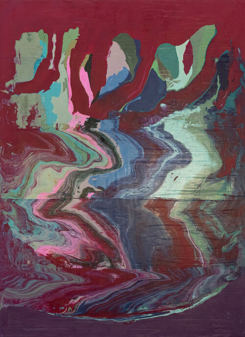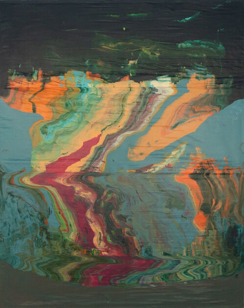 José Yaque’s first solo exhibition at Bode marks the culmination of a nearly decade-long journey exploring the chromatic and formal characteristics of minerals. The show features a series of abstract paintings of undulating patterns inspired by natural phenomena. In these paintings, as elsewhere in his practice, the artist applies pigments by hand, then wraps his canvases in plastic sheeting, using the plastic to make wave-like patterns like layers in a rock formation. The colors appear to disintegrate down the canvas, referencing the process of erosion and the raw and volatile essence of Earth’s subterranean energies.
