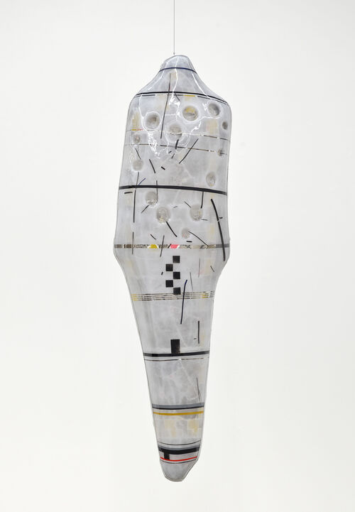 Ragen Moss, who was a breakout name at the 2019 Whitney Biennial, creates hanging, pod-like sculptures out of mostly transparent acrylic, polyethylene, aluminum, and steel, often in series. Delicate, yet somehow sturdy, these suspended forms are painted with patterns and forms, and occasionally with short phrases that invoke immediate reactions. One work at the Whitney Biennial, Romanettes (with double Hearts) (2018), featured the scrawled words “tonight” and “tomorrow” on either side, sandwiching circadian time inside a splotchy, biomorphic form.