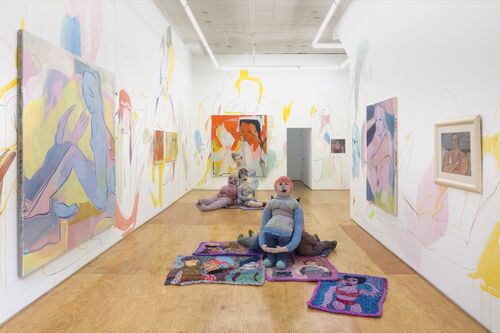Exhibited alongside Rita’s work are new paintings by France-Lise. While best known as a figurative artist, the younger McGurn uses fluid, spare brushstrokes and minimal colors for her relaxed, ethereal subjects. With overlapping limbs and bodies fading into space, France-Lise’s unconstrained figures exude sensual energy. Mirroring the figures spilling onto the rugs surrounding Rita’s sculptures, France-Lise has created a site-specific wall mural with a parade of bodies enveloping the gallery. The exhibition offers an intimate look at the two practices, shedding light on the similarities and differences and inviting the viewer to consider the nuances of mother-daughter relationships.