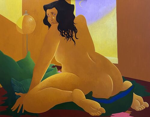 Using her own likeness as an alter ego, Natalie Terenzini navigates the complexities of femininity, embracing her discomfort, awkwardness, and vulnerabilities. In richly colored paintings, Terenzini depicts this character in nude and semi-nude states as she engages in candid scenes layered with emotion. She is often on the brink of transformation—nearing tears, having sex, finishing the last puffs of a cigarette—offering an unwavering glimpse into the emotional and physical weight of the in-between moments and nuances of the female experience.
