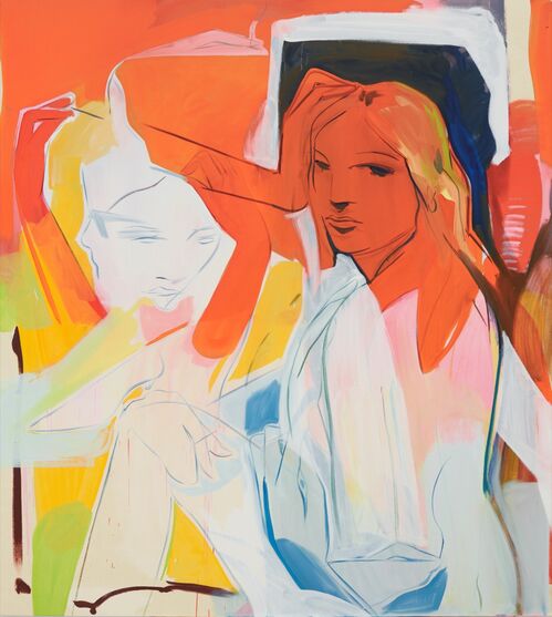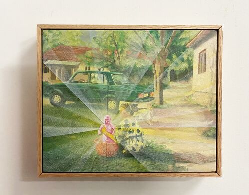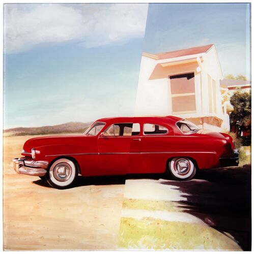 Though her subjects are unknown, Lancaster chooses images of everyday life with minimal context, allowing for broad interpretations that evoke a sense of familiarity. In Goodnight Idols (2023), she homes in on a tender moment between two figures represented only by their intertwining legs and boots. In Recall (2023), meanwhile, Lancaster combines two views of a red vintage car in different settings, perhaps conveying a journey or the passage of time. Mirroring the process of recalling a memory, she paints in reverse on glass, starting with the details and filling in the background.