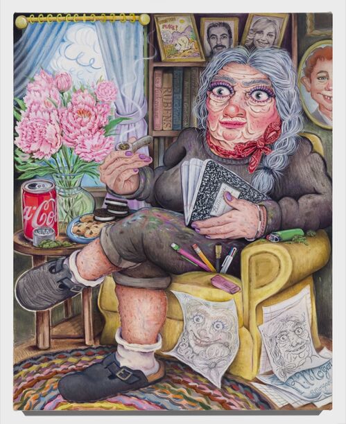 Indeed, the entire show depicts the artist at different stages of the exhibition process, beginning with her frazzled self-depiction in Self-Portrait on the First Day of Summer Break (First Day of Making This Show) (2023). Elsewhere, she looks to the future in another self portrait at age 100, which includes a small cartoon that reads: “What does it all mean?”
