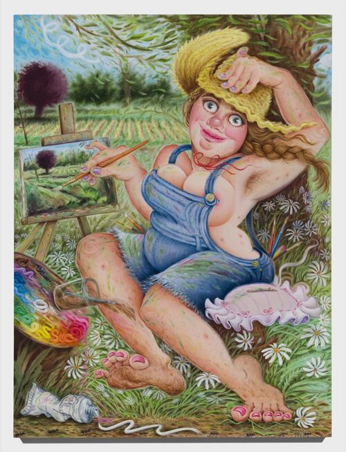 Hints of the latter theme emerge in Hudson Valley Plein Air (May 12, 2023) (2023), which nods to the legacy of landscape painters who admired the natural beauty of the region. Inserting herself into this history, Morgan is seen painting en plein air in Self-Portrait as a Romanticized Painter (2023). A small image of Hudson Valley Plein Air (May 12, 2023) appears on her easel as if documenting her artmaking practice.