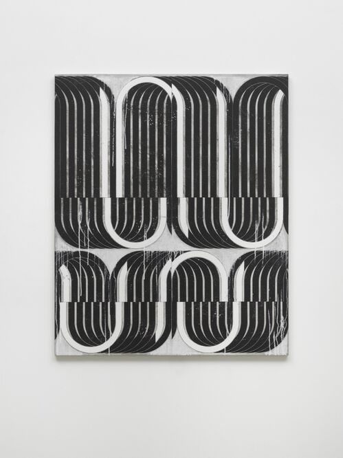 In his new paintings, Balliano returns to geometric abstractions on a larger scale, creating immersive fields out of his monochromatic and black-and-white patterns that he purposefully interrupts with broken circles and arches. In both bodies of work, Balliano brings the viewer’s attention to his materials. He leaves visible glimpses of natural, rough marble and thick drips of paint. In doing so, he pays homage to his Italian heritage and the use of marble in antiquities and architecture while also preserving evidence of his own hand and the effects of gravity acting upon the paint, offering visual cues of unseen natural forces.