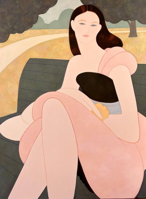 In muted colors and simplified lines, the figures pause on a park bench, stroll past a group of pink flamingos, and rest in the backseat of a car. They wear distinct outfits, from long dresses to patterned shirts, a common theme in Beeman’s work that reflects her own interest in fashion. Their expressions are relaxed but pleasant, as if embracing the hazy lull of the slow days. Offering few visual cues to identify her subjects, Beeman leaves the message up to the viewers and invites them to make their own narrative and personal connections to summer.