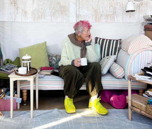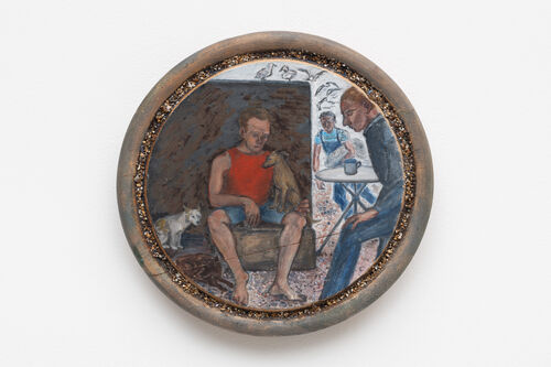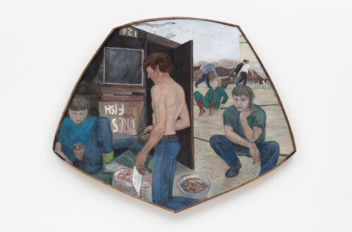 Since the 1970s, Laetitia Yhap has painted scenes of the local fishing community in Hastings, on the southeast coast of England. Having moved to the coastal town from London in the 1960s, Yhap found inspiration in the industry of her new home, particularly in the way it has shifted over the course of her practice from traditional fishing tools, such as wooden boats, to modern alternatives, such as steel. Her canvases, which often take unconventional shapes suggestive of furniture paneling, depict unvarnished scenes of everyday industry in intimate, thoughtful depictions of the men and boys for whom the area is a hub of work and socializing.