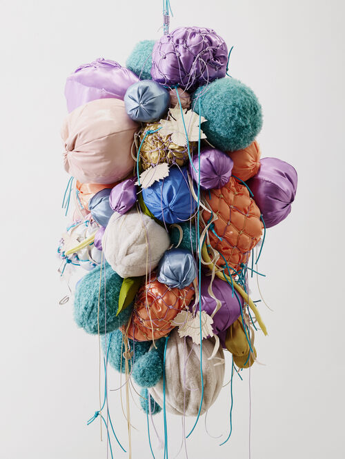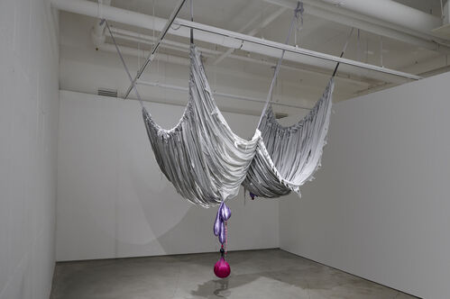 The Great Ballroom continues “Milk and Honey,” Woo’s ongoing series featuring ornately draped swaths of fabric suspended from the ceiling. Like much of Woo’s work, this installation evokes the body with an intriguing combination of reverence and playfulness: The contours of the fabric suggest breasts, while brightly colored soft-sculpture baubles evoke dribbles of milk. Drawing inspiration from Rococo paintings by Jean-Honoré Fragonard and the like, Woo employs luxe, satiny material and decorative shirring that calls attention to its own beauty. In this work, Woo, preoccupied with ideas of aging and bodily transformation, invites viewers to question why the ridged layers of shirred fabric are widely seen as beautiful, while wrinkled skin is not.