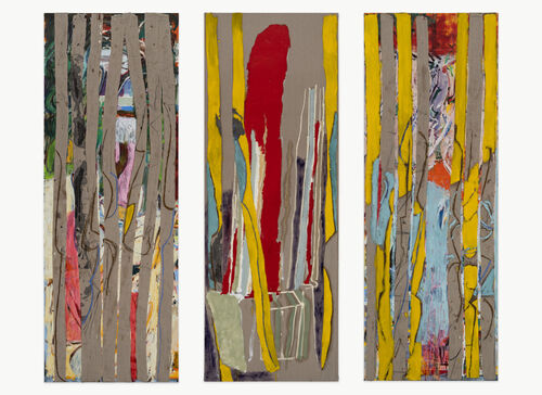 Evelyn’s painting method is intense. Over the course of several months, she takes a very physical approach to large canvases, deploying multiple rounds of painting, scraping, and painting again, working and reworking the medium until final, expressive marks seem to vibrate off the surface. Some works incorporate collage, with strips of canvas adding to the rich textures.