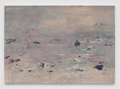 Rheingantz works with a variety of media, including paintings and tapestries, to evoke ambiguous, semi-abstract images of sea cliffs, bodies of water, mountain regions, and arid wastelands. Her paintings are often inspired by her childhood memories of growing up in rural Brazil, where she would often travel across the country and study the landscape. Dense with paint and often expansive in scale, these works are characterized by their rich surface texture and dissolution of image, reminiscent of Cy Twombly’s distinctive markmaking. In another series of smaller-scale tapestries, shown as part of “Sedimentar” at Fortes d’Aloia & Gabriel last year, she turns those brushstrokes into rhythmic stitches, scattered across an embroidered canvas.