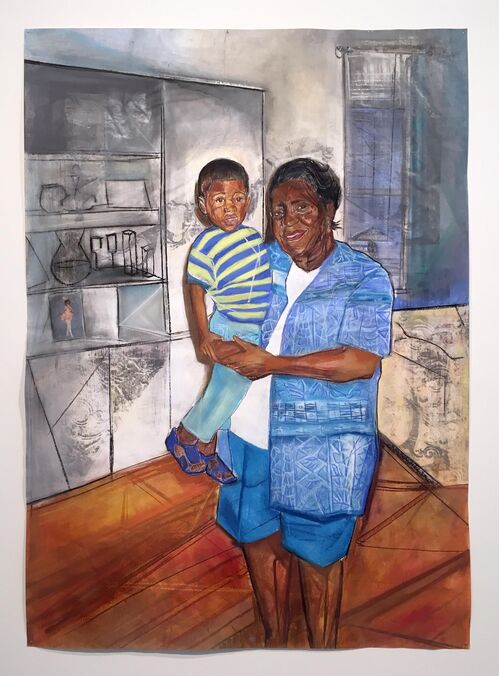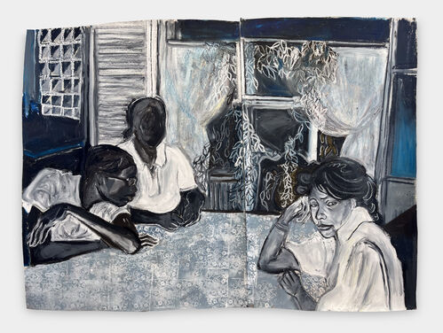 For example, in Kitchen Table (2023), an ink and pastel from the upcoming Kapp Kapp show, Vernon captures a sense of intimate yet diffuse memory, with one of three central figures rendered in fine detail, leaving the other two more anonymous and their faces hard to pinpoint.