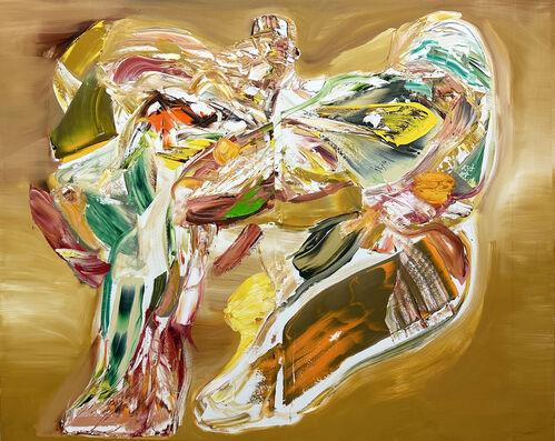 The title of the show, for instance, references a sweet shop, like the one owned by the artist’s great-grandfather—a site of fascination for James, who only fully dedicated himself to painting during the pandemic. Compositionally, this new series of works is inspired by the artist’s early childhood visits to the British Museum, where he would admire the classical forms of busts, friezes, and entablature. These shapes create the basis for his vibrant canvases, which use sweeping, thick brushstrokes to conjure mixed-up, metamorphic forms.